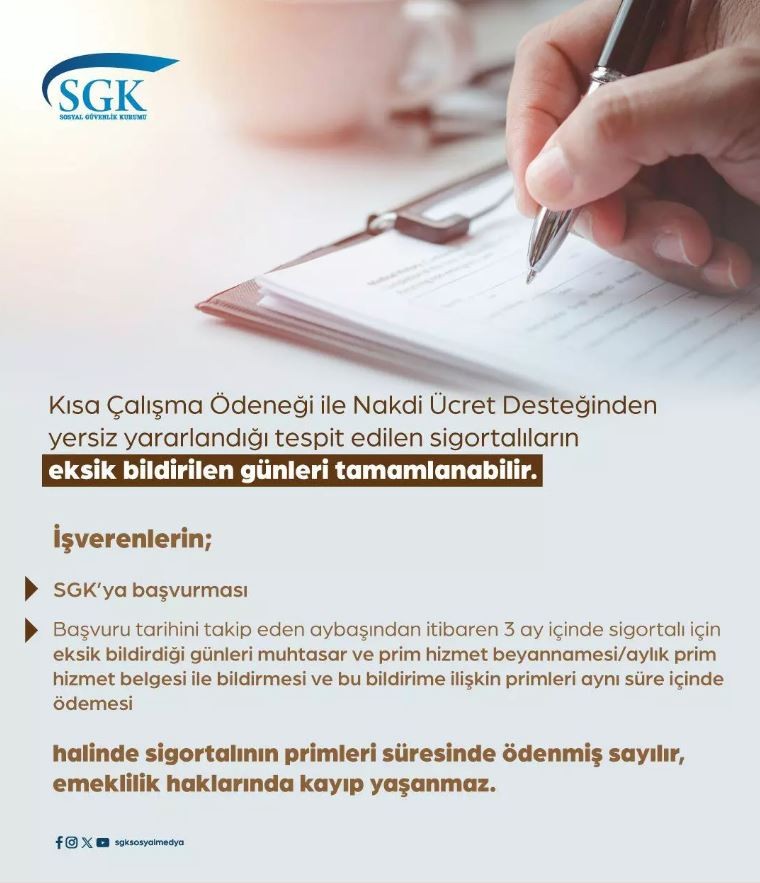 Açıklamada, "Bu kapsamda pandemi döneminde çalışma hayatını ve istihdamı korumak amacıyla oluşturulan kısa çalışma ödeneği ve nakdi ücret desteğinden yersiz yararlandığı tespit edilen yaklaşık 2 milyon çalışanımız için eksik bildirilen günlerini tamamlama hakkı sağladık" ifadelerini kullandı.