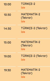 TRT EBA TV canlı 2. sınıf günlük haftalık ders programı