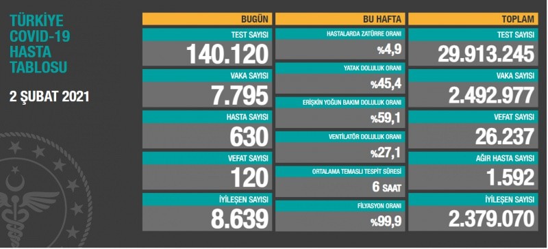 Türkiye'nin 2 Şubat koronavirüs tablosu belli oldu. Sağlık Bakanlığı'nın verilerine göre Türkiye'de son 24 saatte 140 bin 120 Kovid-19 testi yapıldı, 7 bin 795 kişinin testi pozitif çıktı, 120 kişi hayatını kaybetti.