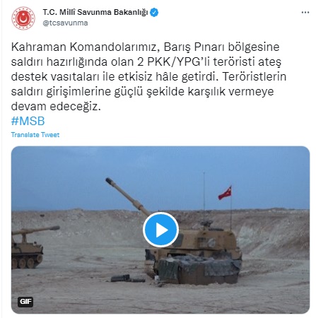 "Kahraman Komandolarımız, Barış Pınarı bölgesine saldırı hazırlığında olan 2 PKK/YPG’li teröristi ateş destek vasıtaları ile etkisiz hâle getirdi. Teröristlerin saldırı girişimlerine güçlü şekilde karşılık vermeye devam edeceğiz."