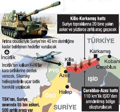 TSK, Suriye sınırında halen 55 bin asker ile 500 zırhlı araç bulunduruyor. Uluslararası koalisyonun ortak kara harekâtına karar vermesi halinde, sınırdaki güçler takviye edilecek. Ankara’nın önerisi Cerablus-Azez hattında 110 km’lik IŞİD’den arındırılmış bölge oluşturulması. Kara harekâtıyla bölgenin IŞİD’den temizlenmesi ve bu alanlara PYD dışındaki muhaliflerin, özellikle de Türkmenlerin yerleştirilmesi. Böylece bölgede demografik yapının korunması. Suriye sınırının 15 km kadar içine girilecek bir kara harekâtının başarıya ulaştırılabilmesi için 4 tugay (20 bin asker) güç kullanımına ihtiyaç olduğu değerlendiriliyor.