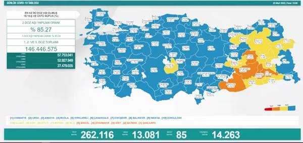 20 Mart'ta açıklanan 24 saatlik verilere göre, 13 bin 081 vaka tespit edildi. Virüs nedeniyle hayatını kaybedenlerin sayısı 85 oldu. Bir günde toplam 262 bin 116 test yapılırken, iyileşen hasta sayısı 14 bin 263 olarak kaydedildi. Sağlık Bakanlığı tarafından açıklanan tabloda, 2 doz aşılama verilerine de yer verildi. En az 2 doz aşı olmuş 18 yaş üzeri nüfusu kapsayan verilere göre Türkiye'de 2. doz aşılama ortalama yüzde 85,27 oldu. 1. doz ortalaması yüzde 93,04 olurken, 1., 2. ve 3. doz aşısını olan vatandaş sayısı toplamda 146 milyon 446 bin 575'e yükseldi.