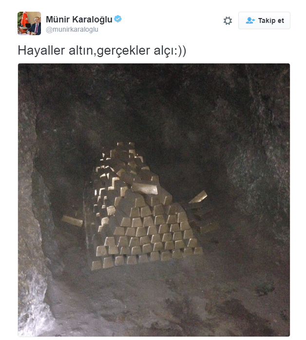 Antalya Valisi Münir Karaloğlu resmi Twitter hesabından bir mağara içinde çekilmiş külçe altın fotoğrafı ile “Hayaller altın, gerçekler alçı” mesajı paylaştı.
