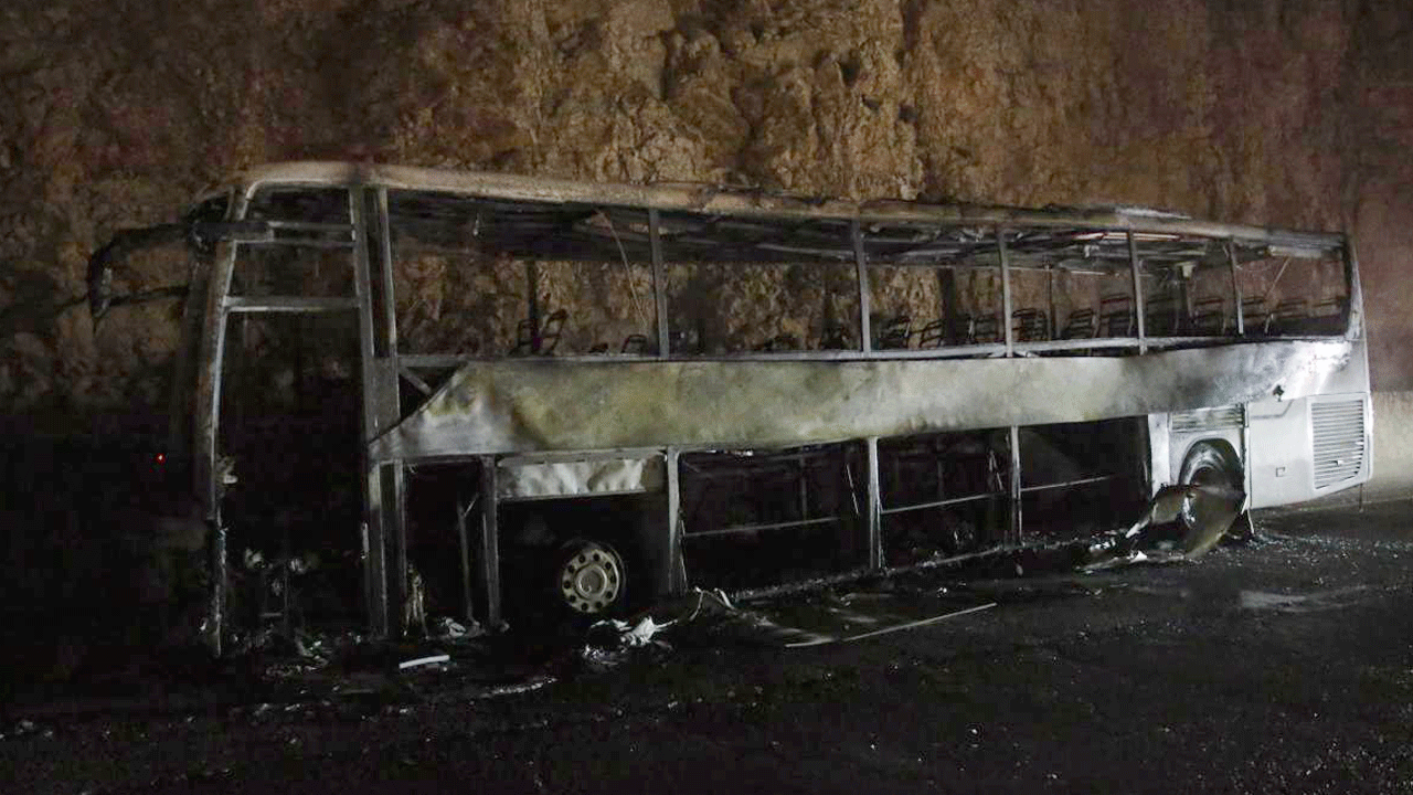 Hatay'ın Belen ilçesinde bir yolcu otobüsünde seyir halindeyken yandı. 20 yolcu canını zar zor kurtarırken otobüste yanacak bir şey kalmayınca yangın söndürülebildi.