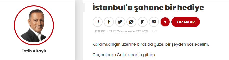 Yazısına, "Geçenlerde Galataport’a gittim." diyerek başlayan Fatih Altaylı, "Neredeyse 150 yılı aşkın süredir İstanbulluların erişimine kapalı İstanbul’un Karaköy ve Salı pazarı arasındaki sahile. Hatırlayacaksınız, 2006 yılında burası özelleştirmeye çıkarıldı. Sami Ofer adlı bir İsrailli işadamı neredeyse bedavaya burayı aldı. O zaman benim başında bulunduğum gazete bu satışa büyük tepki gösterdi." ifadelerini kullandı.