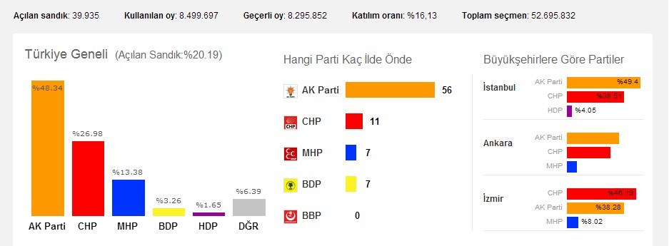 2014 yerel seçimlerinde açıklanan sonuçlara göre 30 büyükşehirdeki son durum..