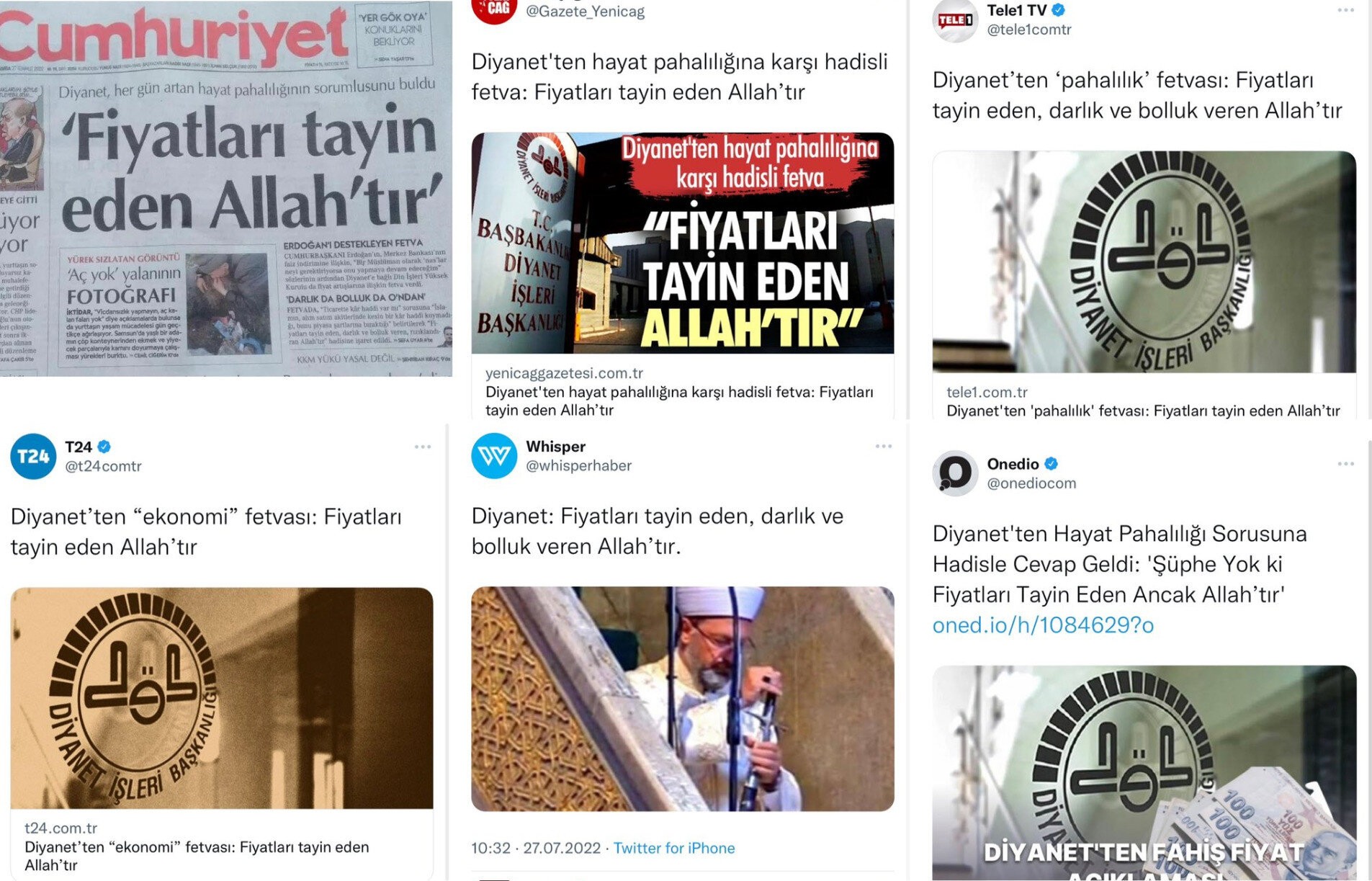 Cumhuriyet Gazetesi, bir skandala imza attı ve "Diyanet her gün artan hayat pahalılığının sorumlusunu buldu" diyerek Hz. Muhammed'in Hadis-i Şerifini çarpıttığı gibi dalga konusu yaptı. Son dönemde fırsatçılık yaparak fahiş fiyat uygulayanlar için Hz. Muhammed'in bir Hadis-i Şerifini cımbızlayıp “Fiyatları tayin eden Allah’tır” ifadesini başlığına taşıdı.