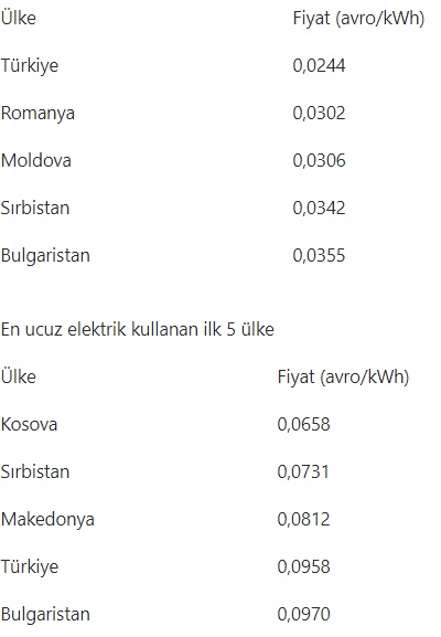 Geçen yıl aralarında 24 AB ülkesi ile Türkiye, Norveç, İzlanda, Kosova, Sırbistan, Makedonya, Moldova ve Karadağ'ın bulunduğu listede, konutlarda kilovatsaat başına en ucuz elektrik tüketen ülke 6,5 avro/cent ile Kosova oldu. Kosova'yı 7,3 avro/cent ile Sırbistan, 8,1 avro/cent ile Makedonya takip etti.