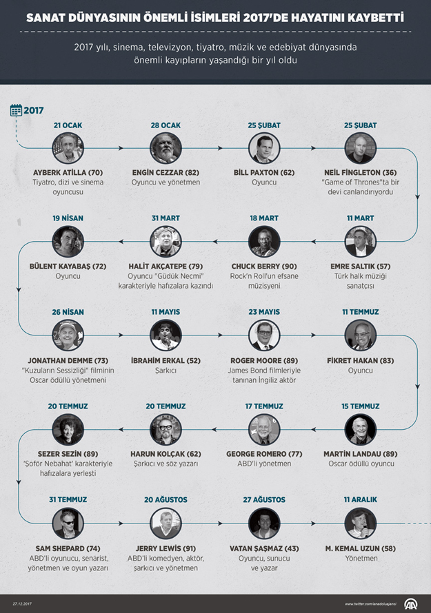 2017 yılında sinema, televizyon, tiyatro, müzik ve edebiyat dünyasında önemli kayıpların yaşandığı bir yıl oldu.