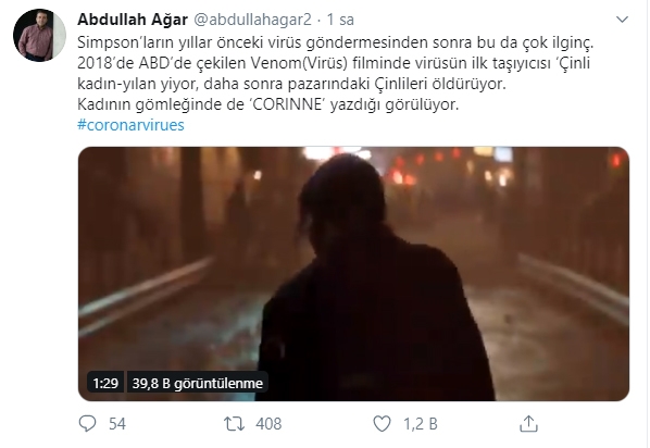 Terör ve Güvenlik Uzmanı Abdullah Ağar da, sosyal medya hesabı Twitter'dan yaptığı paylaşımda bu sahneye dikkat çekerek, "Simpson'ların yıllar önceki virüs göndermesinden sonra bu da çok ilginç. 2018'de ABD’de çekilen Venom (Virüs) filminde virüsün ilk taşıyıcısı Çinli kadın-yılan yiyor, daha sonra pazarındaki Çinlileri öldürüyor. Kadının gömleğinde de 'CORINNE' yazdığı görülüyor. #coronarvirues" ifadelerini kullandı.