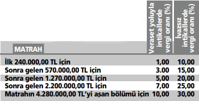 2018 yılında ölüm veya bağışlar nedeniyle intikal eden varlıklar için uygulanacak veraset ve intikal vergisi tarifesi, matrah dilimlerinin yeniden değerleme oranında artması sonucu şöyle oldu: