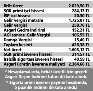 Vergi tarifesi, Asgari Ücret ve Asgari Geçim İndirimi tutarında meydana gelen değişiklikler sonrasında, Asgari Ücret üzerindeki yükler ile Asgari Ücretin işverene maliyeti verileri şu şekilde oluştu: