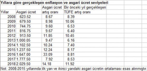 2008-2018 yılları arasındaki son on yıllık dönemde asgari ücrette, 2009 yılı hariç genellikle bir önceki yıl gerçekleşen enflasyonun üzerinde artış yapıldı. Asgari ücretin, 2018 yılında gerçekleşmesi beklenen enflasyon dikkate alınırsa yüzde 20-25 aralığında, 2019 enflasyon hedefi dikkate alınırsa yüzde 20’nin altında artırılması söz konusu olabilir.