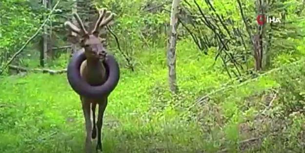Lastiğin geyiğin boynuna nasıl geçtiği ise bilinmiyor.