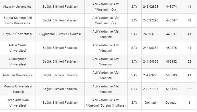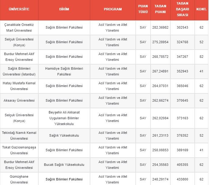 2021 Acil Yardım ve Afet Yönetimi taban puanları ve sıralamaları