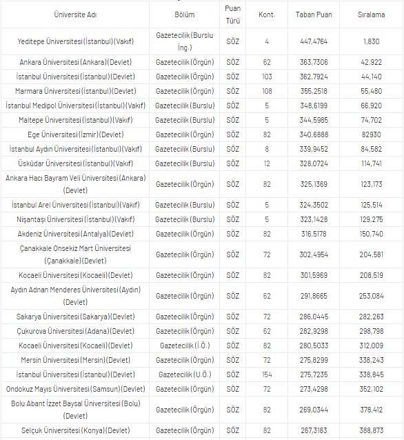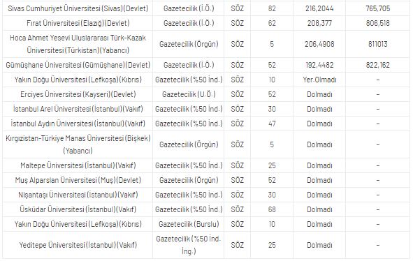 2021 Gazetecilik sıralama ve Gazetecilik taban puanları