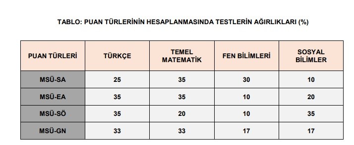 Ağırlıklı puanlar kendi içinde en küçüğü 100, en büyüğü 500 olan puanlara dönüştürülerek adayların MSÜ-SAYISAL (SA), MSÜ-EŞİT AĞIRLIK (EA), MSÜ-SÖZEL (SÖ), MSÜ-GENEL (GN) puanları oluşturulacaktır.