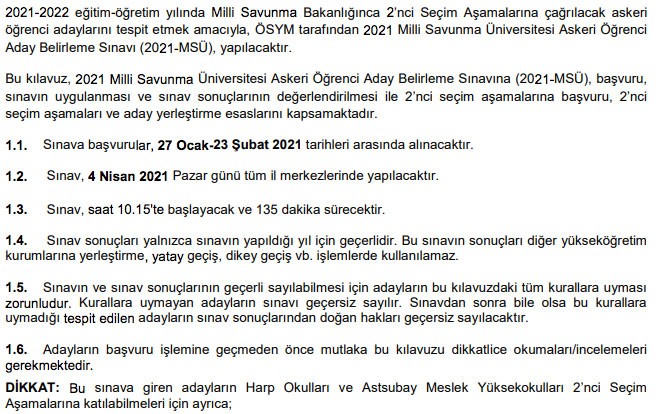 MSÜ, Milli Savunma Bakanlığı ile Ölçme, Seçme ve Yerleştirme Merkezi Başkanlığı (ÖSYM) arasında yapılan protokol çerçevesinde, askeri öğrenci adaylarını tespit etmek amacına ÖSYM tarafından yapılan sınavdır.yönelik sınavdır. 2021 MSÜ aday belirleme sınavına katılmak isteyen ancak 27 Ocak - 23 Şubat 2021 tarihlerinde başvurusunu tamamlayamamış olan adaylar 3 Mart 2021 (bugün) geç başvurularını tamamladı.
