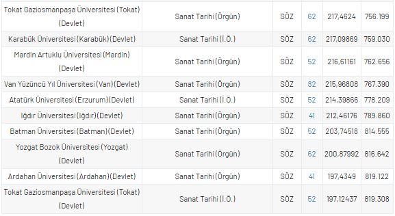 2021 Sanat Tarihi sıralama ve Sanat Tarihi taban puanları