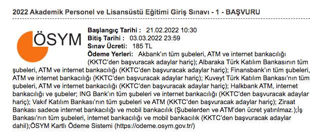 Adaylar sınav ücretini kılavuzun son sayfasında belirtilen bankalardan birine veya ÖSYM'nin internet sayfasında e-İŞLEMLER'de yer alan "ÖDEMELER" alanından kredi kartı/banka kartı ile başvuru süresi içinde yatıracaklardır.