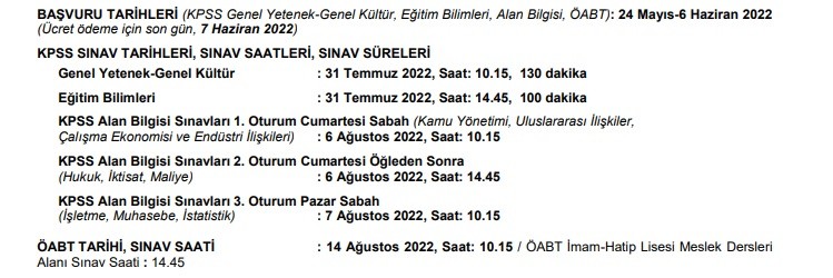 KPSS Lisans (GY,GK/EĞT.B) 31 Temmuz, KPSS Lisans (Alan Bilgisi) 6-7 Ağustos, KPSS ÖABT 14 Ağustos, KPSS Önlisans 2 Ekim, KPSS Ortaöğretim 6 Kasım, KPSS DHBT 27 Kasım tarihinde yapılacak.