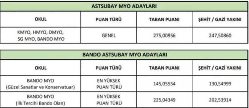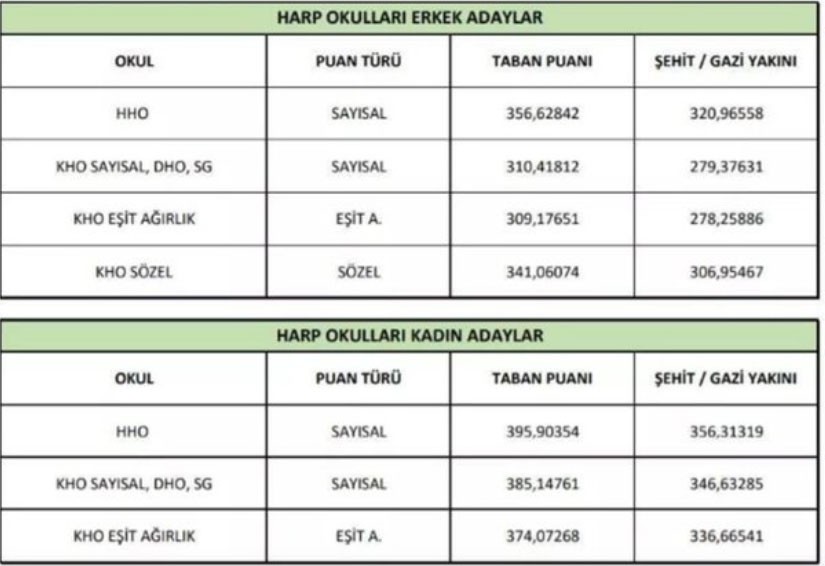 Belirtilen süre içerisinde tercihini yapmayan adaylar, 2'nci seçim aşamalarına çağrılmayacak. Geçtiğimiz yıl erkek adaylar için Hava Harp Okulu sayısal puan türü taban puanı 356,62842 olmuştu. Kara Harp Okulu sayısal puan türü taban puanı ise 310,41812 olarak açıklanmıştı.