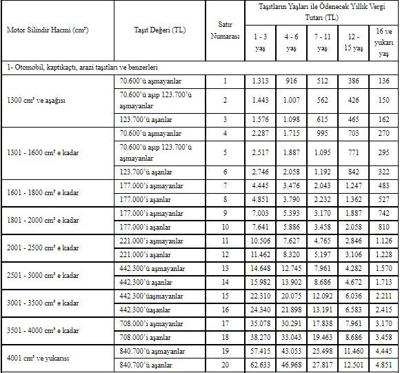 A. (I) Sayılı Motorlu Taşıtlar Vergisi Tarifesi 1/1/2018 tarihinden (bu tarih dahil) sonra kayıt ve tescil edilen otomobil, kaptıkaçtı, arazi taşıtları ve benzeri taşıtlar ile motosikletler aşağıdaki (I) sayılı tarifeye göre vergilendirilir” ifadeleri yer aldı.