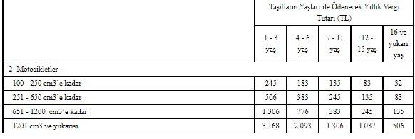 Motosikletlerde ise 1-3 yaş aralığındakilerin MTV'si silindir hacmine göre 245 lira ile 3 bin 168 lira arasında değişecek.