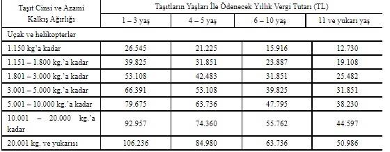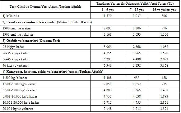 Yıllık vergi tutarı, 1-6 yaş minibüslerde 1570 lira, aynı yaştaki 25 kişiye kadar otobüslerde 3 bin 965 lira, 1500 kilograma kadar kamyonet, kamyon ve benzeri araçlarda 1408 lira olacak.