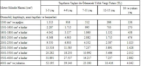 Aynı yaşta, motor silindir hacmi 1301-1600 santimetreküp otomobillerin vergisi de 2 bin 287 lira ile 2 bin 746 lira arasında olacak. 4001 santimetreküp üzerinde motor silindir hacmine sahip otomobillerin vergisi ise 57 bin 415 lira ile 62 bin 633 lira arasında hesaplandı.