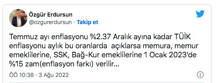 Sosyol Güvenlik Uzmanı Özgür Erdursun, TÜİK'in açıkladığı enflayson verilerinin ardından Twitter hesbaından asgari ücret zammına yönelik bir paylaşımda bulundu. Erdursun sosyal medya hesabındaki paylaşımında "Temmuz ayı enflasyonu %2.37 Aralık ayına kadar TÜİK enflasyonu aylık bu oranlarda açıklarsa memura, memur emeklilerine, SSK, Bağ-Kur emeklilerine 1 Ocak 2023’de %15 zam(enflasyon farkı) verilir." diye yazdı.