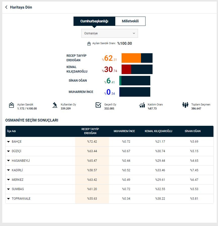 Osmaniye'de sandıkların % 100'ü açıldı. Çıkan sonuca göre; Cumhurbaşkanı Recep Tayyip Erdoğan, % 62.31 oy alırken, Kemal Kılıçdaroğlu, %30.74, Sinan Oğan ise oyların %6.41 'ini aldı.