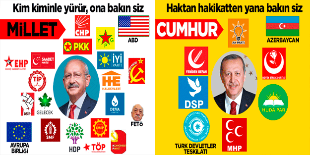 MHP, Yeniden Refah, DSP, HüdaPar ve Büyük Birlik, Cumhurbaşkanı Erdoğan'ı desteklerken. İYİ Parti, Deva ve Gelecek partisi dahil olmak üzere tüm radikal Komunist sol örgütler Kılıçdaroğlu'na destek veriyor. PKK, YPG, FETÖ gibi tüm terör örgütleri de Millet ittifakı adayı Kılıçdaroğlu'na destek vereceklerini açıkladılar.