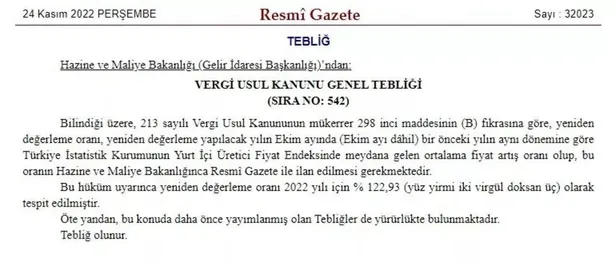 Vergi, harç ve cezaların artışında belirleyici olan yeniden değerleme oranı belli oldu. Resmi Gazete'de yayımlanan kararla birlikte 2023 yılında ceza, harç ve bazı vergilerdeki artışı belirleyen yeniden değerleme oranı yüzde 122.93 olarak ilan edildi.