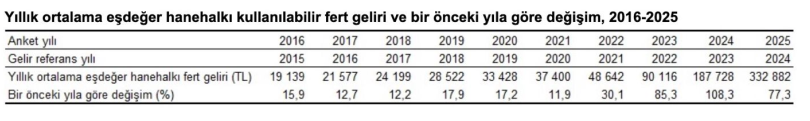 Türkiye'de yıllık ortalama eşdeğer hanehalkı kullanılabilir fert geliri bir önceki yıla göre %77,3 artarak 187 bin 728 TL'den 332 bin 882 TL'ye yükseldi.