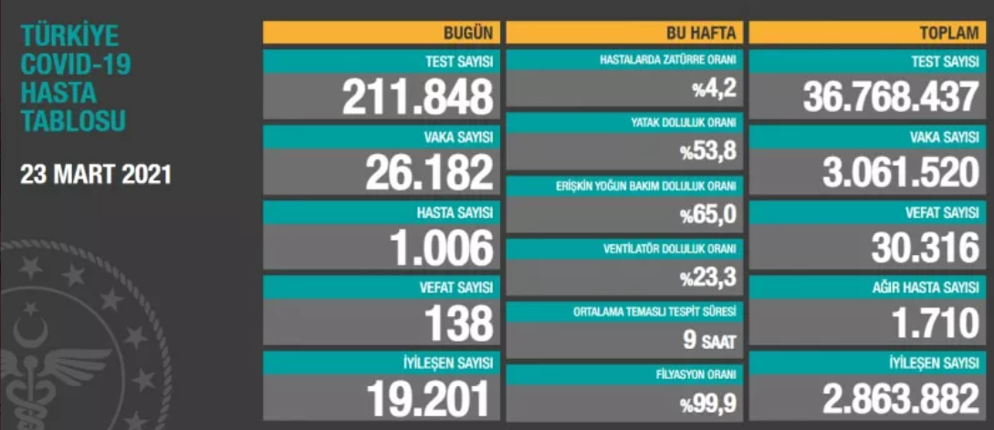 Sağlık Bakanlığı'nın açıkladığı 23 Mart koronavirüs tablosuna göre Türkiye'de son 24 saatte 26 bin 182 kişinin testi pozitif çıktı, 138 kişi hayatını kaybetti.