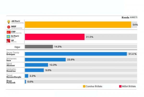 Konda'nın anketinde AK Parti-MHP ittifakı (Cumhur İttifakı) yüzde 54 ile ilk turda kazanıyor. CHP, İYİ Parti ve SP'nin oylarının toplamı ise yüzde 31.5 oluyor.