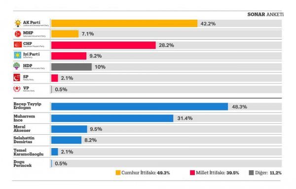 Sonar anketine göre ise AK Parti yüzde 42.2, CHP 28.2, MHP 7.1 oy alıyor, HDP ise yüzde 10 alarak yüzde 9.2 olan İYİ Parti'yi geçiyor. Saadet Partisi yüzde 2.1, Vatan Partisi ise yüzde 0,5 oy alıyor. Bu sonuçlara göre Cumhur İttifakı yüzde 49.3, Millet İttifakı ise yüzde 39.5 oy oranına sahip oluyor ve seçim 2. tura kalıyor.
