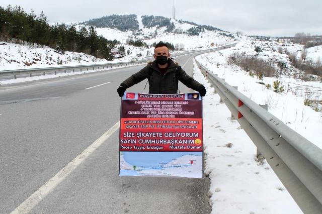 Yaklaşık 580 kilometrelik bir yol yürüyeceğini belirten Mustafa Duman, "Kastamonu'dan İstanbul'a yürüyerek gidiyorum. 1 günlük resmi nikahlı eşim var ve 4 yıldır boşanamıyorum. Bu yüzden nafakaya bağlandım. Her ay 700 lira nafaka ödüyorum. 15 bin lira nafakadan dolayı para biriktiğini öğrendim. Çalışamadığım içinde ödeyemedim. Avukat arıyor beni, kapına icra göndeririz diyor. Avukat sürekli beni arayıp bana da borcun var devletin bir uygulamasından dolayı. Bende avukata sizi ben tutmadım. Siz karşı tarafın avukatısınız, ondan almanız lazım ve beni aramanız yanlış, benden kendi hesabına para istiyor. Bende sesimi duyurabilmek adına böyle bir yürüyüşe kalkıştım. Borçlardan halen kurtulamadım. Devamlı kapıma icralar geliyor, halende kapıma icralar gelip duruyor. Allah razı olsun, bir vatandaş bana 20 bin lira gönderdi. Kendisine kesinlikle ulaşamıyorum, teşekkür dahi edemedim. Bana gönderdiği 20 bin lira parayı borcum olan üç bankaya ödeyerek kapattım. Geride iki bankaya borcum kaldı. Nafakadan dolayı borcum var. Ne yapacağımı şaşırdım artık, bu yüzden bende mağduriyetimi duyurabilmek adına böyle uzun bir yolculuğuna başladım. Yürüyerek İstanbul'a gidiyorum" dedi.