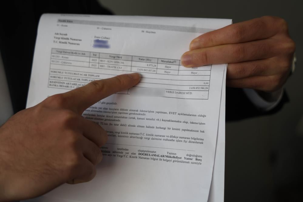 Kozan ilçesinde yaşayan Avukat Emre Çulhacı, adına 2 milyar 650 milyon 843 bin 607 lira tutarında trafik cezası kaynaklı vergi borcu göründüğünü öğrenince hayatının şokunu yaşadı. Türkiye'de geçen yıl kesilen toplam trafik cezalarının yaklaşık 30'da birine denk gelen rakam karşısında şoku atlatan avukat Çulhacı, yaptığı görüşmelerle hatayı düzelttirdi.