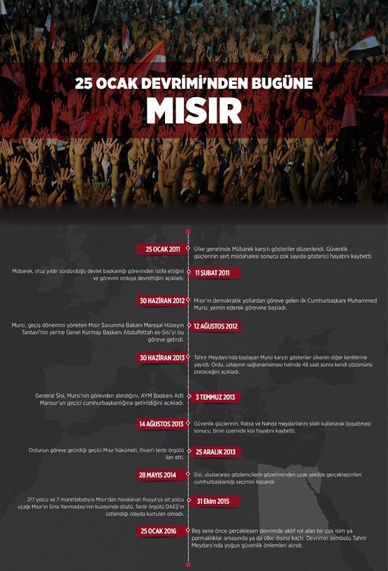 Tunuslu genç seyyar satıcı Muhammed Buazizi'nin kendini yakarak tetiklediği "Arap Baharı" diye isimlendirilen süreç Mısır sokaklarına 25 Ocak tarihinde ulaştı. Ülkedeki 30 yıllık cumhurbaşkanı Hüsnü Mübarek yönetiminin sonunu getiren ayaklanmalar, aradan geçen beş yıl içinde ülke ve bölgenin geleceğinde izler bırakacak önemli birçok birçok olayın başlangıcı oldu.