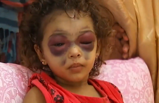 İsrail savaş uçaklarının bombardımanında evi yıkılan ve ailesinden çok sayıda kişiyi kaybeden Filistinli 2,5 yaşındaki kız çocuğu hastanede tedavi altına alındı. Burnu kırılan ve yüzünün ön tarafındaki kemikleri ezilen bebeğin iki gözü mosmor olmuş durumda. Gözlerini açmakta zorlanan kız çocuğu İngiliz haber ekibinin kamerasına takıldı. Tecrübeli haberci Jon Snow küçük kız çocuğunun büyük bir şok geçirdiğini söyledi. Onun hemen yanındaki sedyede yatan 7 yaşındaki Nurettin'in de yüzündeki morluklar dikkat çekti.