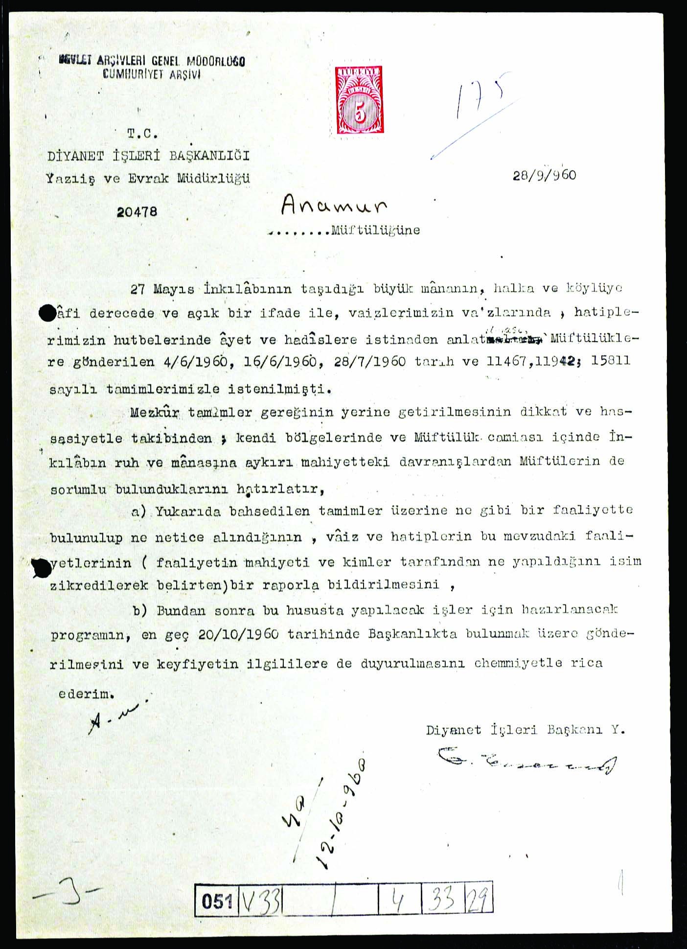 28 Temmuz 1960 tarihinde müftülüklere gönderilen yazıda ise darbenin dini bakımdan “kıymet ve manasını” halka anlatmanın en mühim vazife olduğunun altı çizilerek Diyanet teşkilatına ve teşkilat mensuplarına önemli görevler düştüğü belirtildi. Belgede, “İnkılap hakkında yapılacak konuşmalar için “Esaslar”ı muhtevi ilişik broşürden faydalanılarak ve daha önce yapılan tamimler ve hepinizin malumu bulunan ayet ve hadisler örnek tutularak, müftü ve vaizler tarafından yapılacak vaaz ve nasihatlerle, hatipler tarafından okunacak hutbelerle halkımızın aydınlatılmasını ehemmiyetle rica ederim” ifadelerine yer verildi. 28 Eylül 1960 tarihli belgede ise inkılap olarak tanımlanan darbenin, daha önceki tamimlerde vaizler ve hatipler tarafından hutbelerde ayet ve hadislerle halka anlatılmasının istendiği hatırlatıldı. Emirlerin yerine getirilmesinin sorumluluğunun müftülerde olduğu uyarısı yapılan tamimde ayrıca yapılan çalışmalarla ilgili detaylı raporlar istendi.