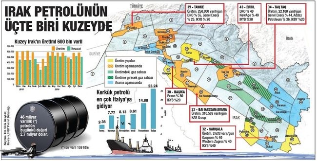 Kavganın simgesi haline gelen Kerkük'ün Irak petrolü içindeki payı ise yüzde 12.3'e denk geliyor. Dün ele geçirilen kuyuların bir diğer özelliği de dünyanın en eskilerinden olmaları. Dünya, 1927'de BP ve Total'in ilk yöneticileri tarafından keşfedilen Kerkük petrolü için I. Dünya Savaşı'ndan bu yana gerçekleştirilen son savaşı izliyor. Kerkük petrolünün ihraç edildiği ülkeler ağırlıklı olarak Avrupa'da. En yüksek ihracat İtalya'ya yapılıyor. Ardından Yunanistan ve üçüncü olarak da İsrail geliyor. Irak'ın kuzeyinde birçok petrol bölgesi var. Halihazırda 20 yeni bölgeye lisans verilmiş durumda.