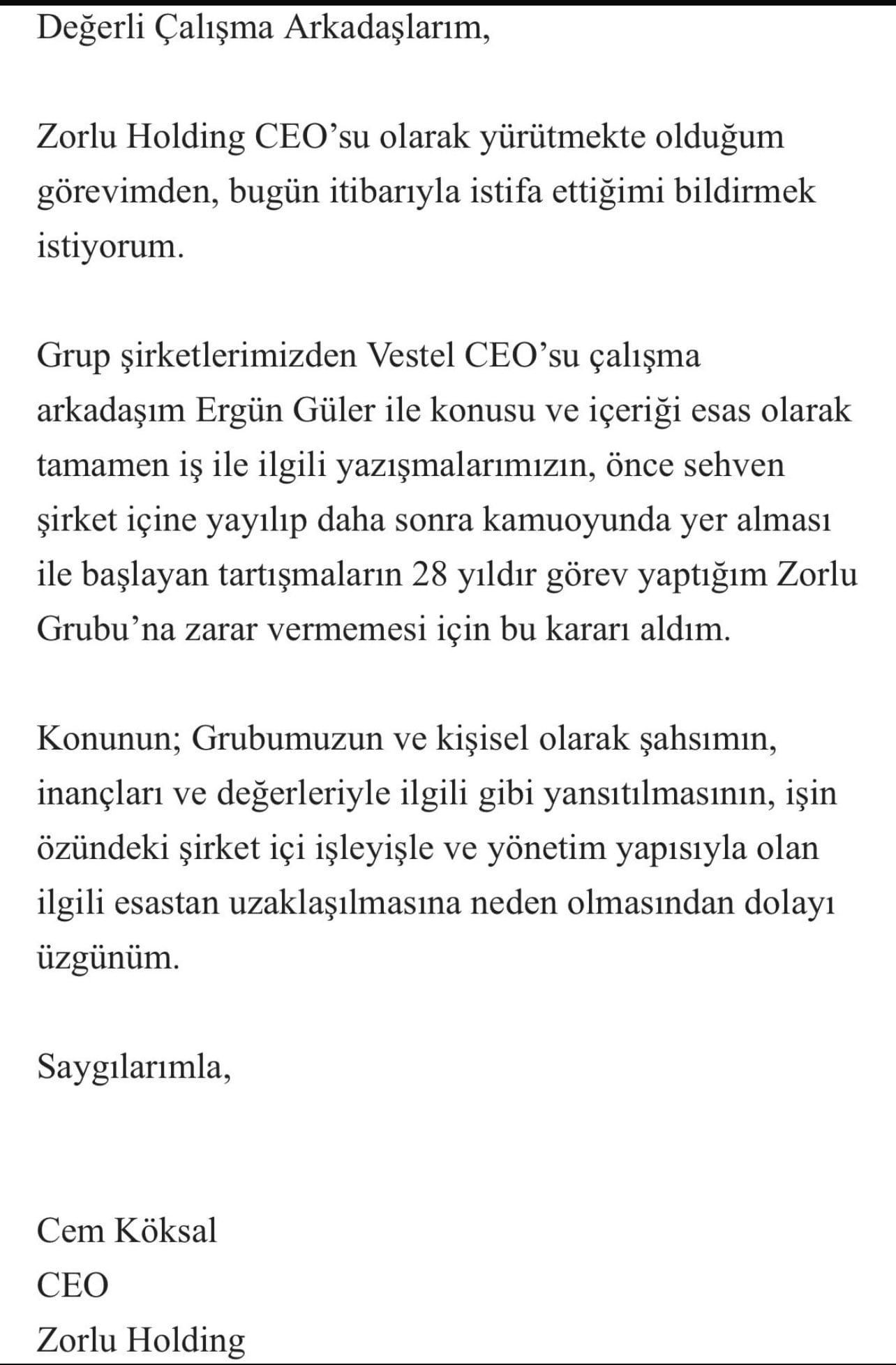 Grup şirketlerimizden Vestel CEO'su çalışma arkadaşım Ergün Güler ile konusu ve içeriği esas olarak tamamen iş ile ilgili yazışmalarımızın, önce sehven şirket içine yayılıp daha sonra kamuoyunda yer alması ile başlayan tartışmaların 28 yıldır görev yaptığım Zorlu Grubu'na zarar vermemesi için bu kararı aldım.