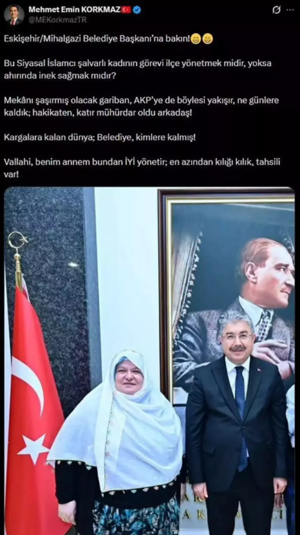 İYİ Parti kurucu üyelerinden Mehmet Emin Korkmaz, sosyal medya hesabından AK Partili Mihalgazi Belediye Başkanı Zeynep Güneş'i başörtüsü ve kıyafeti üzerinden hedef aldı.