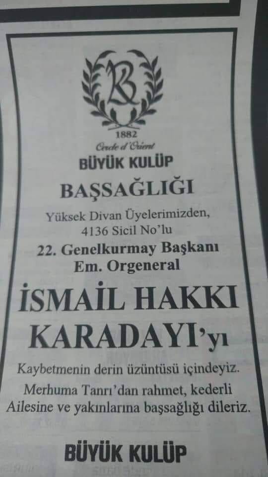 28 Şubat zulmünün baş mimarlarından emekli Orgeneral İsmail Hakkı Karadayı, masonik yapılanma olarak bilinen Büyük Kulüp’ü derinden üzdü. Söz konusu yapılanma, üyesi Karadayı için taziye mesajı yayınladı.