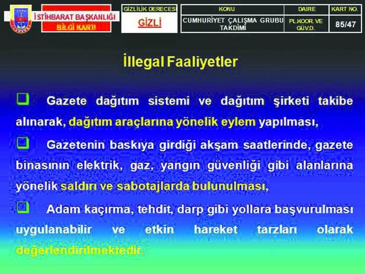 Müslümanların üzerine karabasan gibi çöken 28 Şubatçıların bir başka ayağında ise gazetemiz Akit’i bitirme planı vardı. 28 Şubat sürecinde illegal bir şekilde kurulan Batı Çalışma Grubu benzeri bir yapılanma olan Cumhuriyet Çalışma Grubu’nun hazırladığı eylem raporunda, gazetemizin çalışamaz hale getirilebilmesi için yapılacak eylemler sıralanıyordu. Hakk’ın ve hakikatin gür sesini susturmak için çırpınan darbecilerin, Jandarma Genel Komutanlığı İstihbarat Daire Başkanlığı’na sunduğu sözde raporunda, gazetemizle mücadele için legal ve illegal yollara başvurulmasının planlandığı yer alıyordu. Legal faaliyetler başlığı altında Akit’in yönetici ve yazarlarının ailevi yaşantılarının teknik takibe alınarak araştırılması, yazarların özel hayatları ile ilgili mahremiyetlerinin başka gazetelerde yayınlatılması, gazetenin aleyhinde sürekli ve yoğun bir şekilde tazminat davalarının açılması ve böylece gazetenin ekonomik sıkıntıya sokularak çalışamaz hale getirilmesi gibi eylemler bulunurken, illegal faaliyetler başlığı altında ise, gazete baskı tesislerinin ve dağıtım araçlarının kundaklanması, dağıtım elemanlarının darp edilip tehdit edilmesi gibi korkunç planlar da yer alıyor. Yine o dönem çetecilikten yargılanıp 208 yıl hapsi istenen Kasım Gençyılmaz’a iftira ettirilmek suretiyle merhum Hasan Karakaya ile Hasan Hüseyin Maden apar topar gözaltına alınıp Ankara’ya götürüldü. Cinayet sanığı Kasım Gençyılmaz adlı bir çeteciye, Akit yazarlarına iftira atması karşılığında cezasının indirileceği söylendi. Çeteci Gençyılmaz da “Akit’te çalışan Hasan adlı birinin, kendisini kiralık katil olarak tutmak istediği” iftirasında bulundu. Cumhuriyet Çalışma Grubu’nun eylem planında istenildiği gibi yazarlara iftira atılmış ve apar topar gözaltına alınmaları sağlanmıştı.