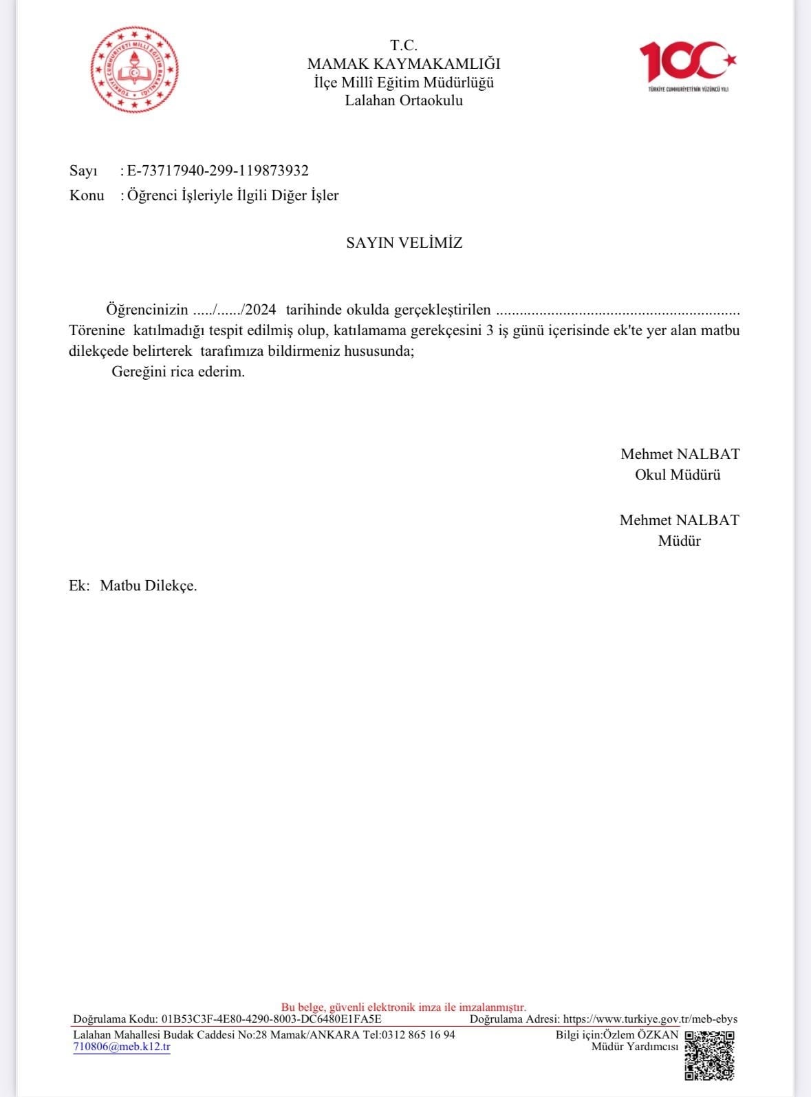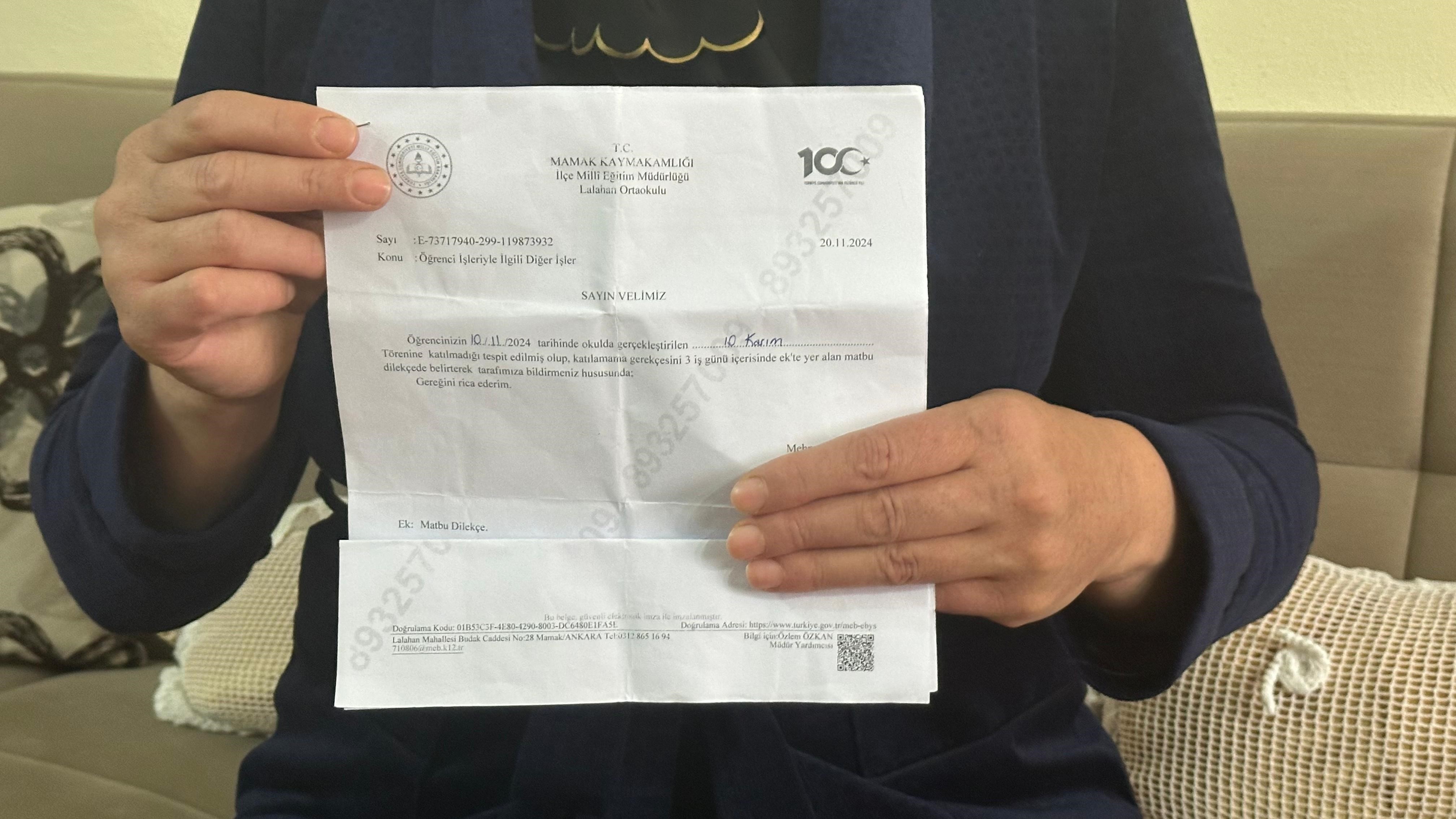 Olay, Mamak ilçesinde bulunan Lalahan Ortaokulu’nda meydana geldi. 10 Kasım Atatürk’ü Anma Günü nedeniyle okulda düzenlenen törene 60 öğrenci katılmadı. Okul yönetimi, törene katılmayan öğrencilerin velilerine tebligat göndererek, öğrencilerin törene katılmama gerekçesini sordu. Törene katılmayan bir öğrencinin velisi olan Semra Polat, “Kasım ayının ilk haftası oğlum grip rahatsızlığı nedeniyle aile sağlığı merkezine gitti. Orada doktor çocuğun grip olduğunu, okula gitmemesi gerektiğini, bulaş yaymaması için hastalığı süresince evde dinlenmesi gerektiğini söyledi. Dolayısıyla biz raporu okula tebliğ ettik. Sonrasında oğlum evde istirahate geçti, kasım ara tatili girdi. Evde istirahat ederek iyileşmeye çalıştı” dedi.
