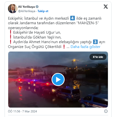İçişleri Bakanı Ali Yerlikaya, 4 ilde düzenlenen Mahzen 5 Operasyonlarının detaylarını sosyal medya hesabından yaptığı bir paylaşımla duyurdu. Yerlikaya, operasyonlar neticesinde Eskişehir’de Hayati Uğur’un, İstanbul’da Gökhan Yaşlı’nın, Aydın’da Ahmet Hano’nun elebaşılığını yaptığı 3 ayrı organize suç örgütünün Jandarma kuvvetlerince çökertildiğini açıkladı.